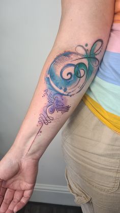 The green symbol at the top by my elbow has two meanings depending on the language you speak so either means inner strength or unconditional love.